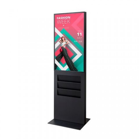 Digital Totem Rack kombinuje elegantní displej s integrovaným stojanem na brožury. Bezrámečkový design dodává moderní a čistý vzhled. Tři prostorné kapsy umožní prezentaci až 6× A4 tiskovin. Skvělé řešení pro showroomy, vstupní prostory a výstavní centra.Digitální totem Smart Line s Kapsou 6 x A4