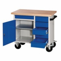 Mobilní pracovní stůl vhodný pro práci v dílnách, servisech a jiných zařízeních a provozech. Pracovní deska je vyrobena z bukové spárovky o tloušťce čtyři centimetry. Ve spodní části stolu se nachází šest zásuvek o různých výškách a skříňka s jednou výškově nastavitelnou policí.Mobilní svařovaný dílenský stůl Rivt, 94 x 99 x 59 cm