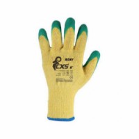 Povrstvené pracovní rukavice pletené z polyesteru a bavlny. Zelená latexová vrstva pokrývá dlaň a přední stranu prstů.Polyesterové rukavice CXS polomáčené v latexu, zelené/žluté