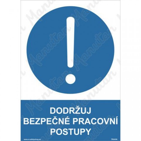Bezpečnostní značení tabulkou, značkou nebo samolepkou "Dodržuj bezpečné pracovní postupy" tiskneme na vysoce kvalitním materiálu, barvami s vysokou odolností proti otěru a UV záření. Tím zajišťujeme splnění požadavků Nařízení vlády č. 375/2017 Sb., ČSN ISO 3864-1, ČSN ISO 3864-2, ČSN ISO 3864-3, ČSN ISO 3864-4.Příkazové tabulky - Dodržuj bezpečné pracovní postupy
