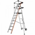 Hliníkové pracovní schůdky se sedmi stupni a pracovní plošinou. Pracovní plošina má rozměr 40,5 x 51 cm, je perforovaná a vybavená ochranou proti sklouznuti nohy. Bezpečnostní zábradlí s plastovým držákem na nářadí a s popruhy pro zabezpečení osoby. Schůdky jsou skládatelné a lze je jednoduše přemístit pomocí dvou pojezdových koleček o průměru 150 mm. Stabilitu při rozložení zajišťují kovové stojiny. Příčky mají protiskluzový povrch a šíři 85 mm. Schůdky jsou opatřené plastovými patkami.Pojízdný hliníkový plošinový žebřík Facal s držákem, 7 stupňů
