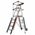 Mobilní skládací hliníkový žebřík s plošinou a čtyřmi stupni. Vhodný do skladů a archivů. Plošina i stupně jsou opatřeny bezpečnostním zábradlím. Součástí jsou dvě kola s automatickou blokací o průměru 125 mm. Rozměry složeného žebříku jsou 261 x 80 x 82 cm. Stupně jsou od sebe vzdáleny 24 cm.Pojízdný skládací hliníkový plošinový žebřík, 4 stupně