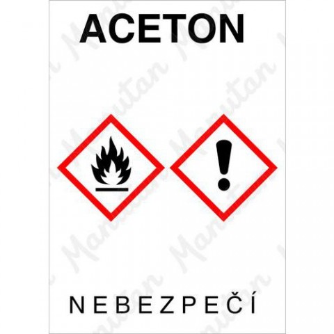Tabulky, značky a samolepky "ACETON" jsou tištěny na vysoce kvalitním materiálu, barvami s vysokou odolností proti otěru a UV záření. Provedení je plně v souladu s požadavky právních a technických předpisů, zejména Nařízení vlády č. 375/2017 Sb., ČSN ISO 3864-1, ČSN ISO 3864-2, ČSN ISO 3864-3, ČSN ISO 3864-4.Výstražné GHS tabulky - Aceton