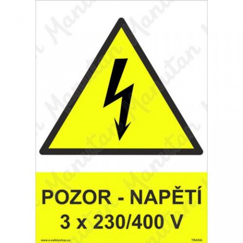 Bezpečnostní značka, tabulka nebo samolepka "Pozor napětí 3 x 230/400 V" plně odpovídá požadavkům právních a technických předpisů, zejména Nařízení vlády č. 375/2017 Sb., ČSN ISO 3864-1, ČSN ISO 3864-2, ČSN ISO 3864-3, ČSN ISO 3864-4.Výstražné tabulky - Pozor napětí 3 x 230/400 V