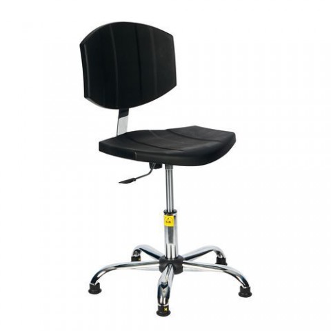 ESD otočná židle s využitím v průmyslu, dílnách nebo laboratořích. Nastavení výšky sedáku pomocí pneumatického pístu. Sedák a opěradlo z polyuretanové pěny a podstavec z chromované oceli. Hmotnost židle je 13 kg.Antistatická ESD pracovní židle Carl s kluzáky
