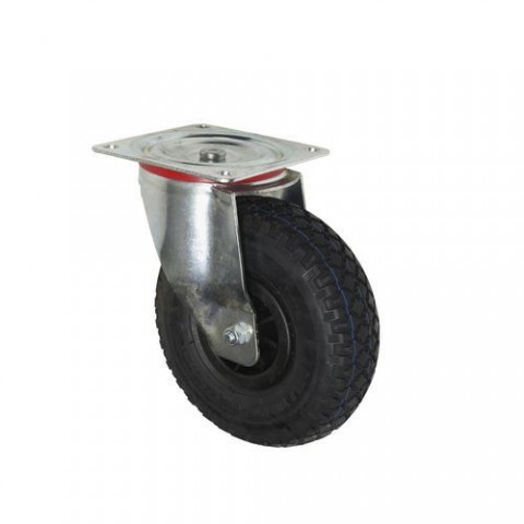 Otočné bantamové kolo s černou obručí a červeným plastovým diskem. Šetrné vůči podlaze, nízký odpor při rozjezdu. typ kola: otočné materiál kola: guma průměr kola: 260 mm šířka kola: 85 mm nosnost: 150 kg způsob uchycení: vidlice s přírubou výška kola s vidlicí: 305 mm vyložení kola: 77 mm ložiska: valivá (jehlová) povrchová úprava pozinkováním, dvouřadý kuličkový věnec ve vidlicové hlavěBantamové kolo s přírubou, průměr 260 mm, otočné, valivé ložisko