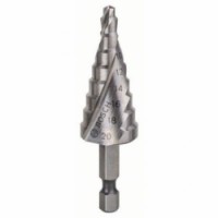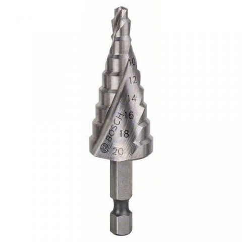Vhodné pro téměř všechny tenké materiály, např. neželezné kovy, ocelové plechy, plasty nebo nerezovou ocel. Bez předvrtávání, bez otřepů do tenkých plechů. pro odstraňování otřepů, kruhové otvory, vrtání více průměrů jedním vrtákem, navrtávání stávajících otvorů. Spirálová drážka pro delší životnost, menší vibrace a rychlejší postup vrtání. Vyznačení průměru na obou spirálách. Stopka se 3 ploškami proti prokluzování ve sklíčidle. Dostupné ve třech provedeních:HSS = 100% životnostHSS-TiN = 125% životnostHSS-AlTiN = 150% životnost (není nutné chlazení) balení: 1 x BAL, 1ks v BAL výška stupně: 4 mm typ: HSS; HSS-AlTiN; HSS-TiN délka: 70,5 mm o vrtáku: 4-20 mmBosch - Stupňovitý vrták, šestihranná stopka