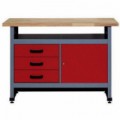 Dílenský stůl se třemi zásuvkami a jednou uzamykatelnou skříňkou. Jedna police uvnitř skříňky. Pracovní deska je vyrobena z bukové spárovky o tloušťce 30 mm. Zásuvky jsou uloženy na kuličkových výsuvech, které umožňují vysunutí na 70 %. Kvalitní konstrukce stolu z ocelového plechu zajišťuje dobrou stabilitu. Nohy stolu jsou opatřeny vyrovnávacími šrouby. rozměry v x š x h: 84 x 120 x 60 cm materiál pracovní desky: buková spárovka tl. 30 mm výška zásuvky: 12 cm nosnost zásuvky: 25 kg hmotnost: 48 kg cylindrický zámek - 2 klíče, dodáváno v demontovaném stavu (spojovací materiál součástí balení)Dílenský stůl Monti, 84 x 120 x 60 cm, 3 zásuvky, 1 skříňka