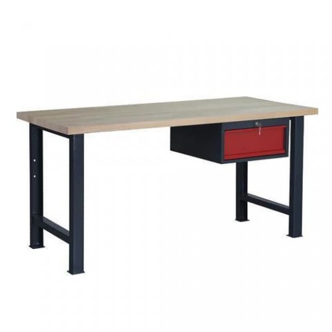 Dílenský stůl Weld ve dvou barevných variantách složený z pracovní desky, pevného podnoží a zásuvky. Stůl je stabilní a vyhovuje i náročnějším pracovním úkolům díky robustnímu provedení podnoží a vyšší váze bukové spárovky. Pracovní deska 170 x 80 cm z bukové spárovky tl. 4 cm, sražené hrany, bez povrchové úpravy. Maximální nosnost pracovní desky při rovnoměrném zatížení 500 kg. Svařovaná zásuvka v x š x h: 18 x 51 x 59 cm, výsuv 100%, kuličková ložiska pojezdů. Zásuvka uzamykatelná cylindrickým zámkem se dvěma klíči. Pevné podnoží z ocelového U - profilu 50 x 70 cm, tl. 3mm a ocelových plechů tl. 0,8 mm. Otvory v pracovní desce pro montáž podnoží nebo skříněk nutno předvrtat vrtákem pr. 4 - 4,5 mm (pro vrtání zvolte taková místa, kde se vyhnete spojům jednotlivých lamel stolu). Desku doporučujeme impregnovat speciálním olejem, především pokud je stůl umístěn ve vlhkém prostředí. Povrchová úprava kovových částí práškovým lakem.Dílenské stoly Weld, 84 x 170 x 80 cm