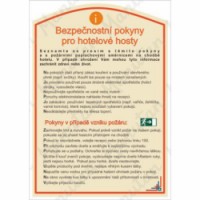 Bezpečnostní značky, tabulky nebo samolepky "Bezpečnostní pokyny" splňují požadavky právních a technických předpisů, zejména Nařízení vlády č. 375/2017 Sb., ČSN ISO 3864-1, ČSN ISO 3864-2, ČSN ISO 3864-3, ČSN ISO 3864-4.Informační tabulky - Pro hotelové hosty