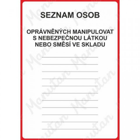 Bezpečnostní značení tabulkou, značkou nebo samolepkou "Seznam osob opravněných manipulovat" tiskneme na vysoce kvalitním materiálu, barvami s vysokou odolností proti otěru a UV záření. Tím zajišťujeme splnění požadavků Nařízení vlády č. 375/2017 Sb., ČSN ISO 3864-1, ČSN ISO 3864-2, ČSN ISO 3864-3, ČSN ISO 3864-4.Informační tabulky - Seznam osob opravněných manipulovat