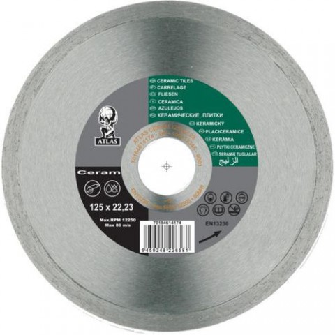 Diamantový celoobvodový kotouč vhodný na řezání keramických obkladů, dlažby či a kachlových obkladů pomocí úhlové brusky.Kotouč diamantový, Atlas Ceramic