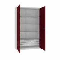 Dílenské kovové skříně se třemi zásuvkami a čtyřmi policemi vhodné pro profesionální použití ve vnitřních suchých a větraných prostorách. Monolitická svařovaná konstrukce z oceli tl. 1 mm zajišťuje vysokou pevnost. Křídlové dveře s tříbodovým zámkem RONIS (dodáváno se 2 klíči). Vyrovnávací nožky, které jsou nastavitelné zevnitř. Posuvníky pro snadný pohyb skříně a ochranu podlahy. Pro vysokou bezpečnost lze přikotvit ke zdi. Před lakováním jsou skříně potaženy zirkoniovou vrstvou, která je chrání před korozí a zvyšuje přilnavost laku. Skříně jsou opatřené nátěrem, který má klasifikaci reakce na oheň: A2-s1, d0 dle norem PN-EN 13501-1:2019-02. Vyráběno v souladu s normami ISO:9001 a ISO:14001.Kovové dílenské skříně, 199 x 120 x 50 cm, 3 zásuvky
