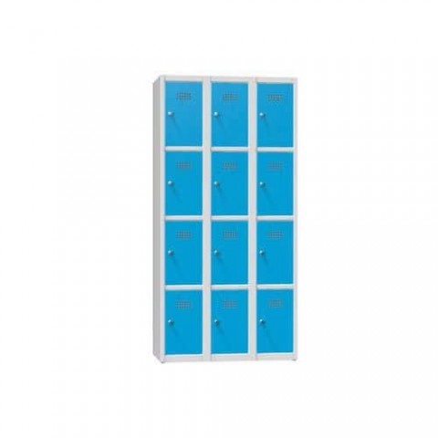 Plechové šatní skříně s 12 boxy pro uložení drobných osobních věcí. Dveře jednotlivých boxů jsou uloženy na vnitřních pantech s úhlem otevření více než 90°. Šatníky jsou standardně vybaveny cylindrickým zámkem pro každou buňku. Součástí jsou plastové háčky pro zavěšení uschovaných věcí. Větrací otvory ve dvířkách. K dostání ve třech barevných variantách.Kovové šatní skříně, 12 boxů, 1850 x 900 x 500 mm, šedá