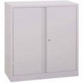 Spisová skříň s roletou v různých barevných variantách. Výškově přestavitelné police. Cylindrický zámek, dva klíče.Kovové spisové skříně s roletou, 2 police, 105 x 100 x 45 cm