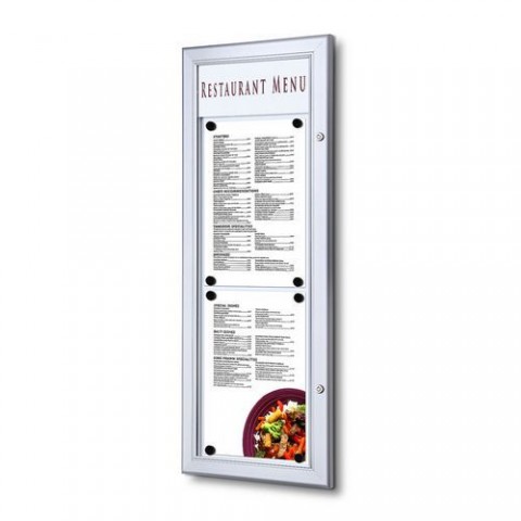 Magnetické vitríny s hliníkovým rámem v stříbrné barvě vhodné jak do interiéru, tak do krytého exteriéru. Připevnění stránek pomocí magnetů. Prostor pro logo je standardně dodáván bez potisku.Magnetické vitríny Menu, jednokřídlé
