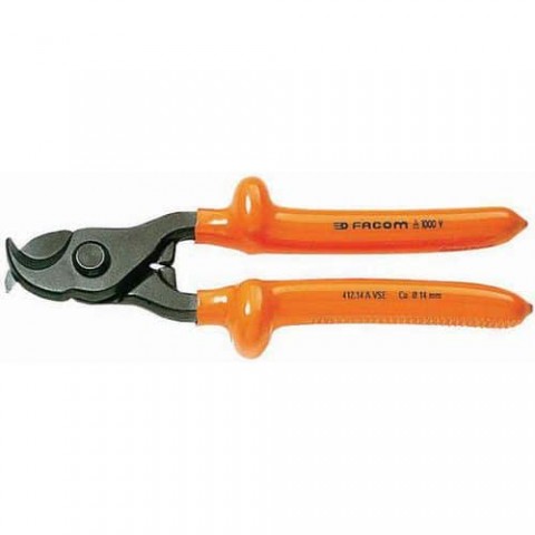 Velké zarážky na rukojetích zaručují bezpečnost uživatele. Reliéfní značení izolačních norem a dat na kleštích. Rukojeti izolované pruhovaným pružným opláštěním pro vynikající úchop.Nůžky na kabely Facom, 230 mm