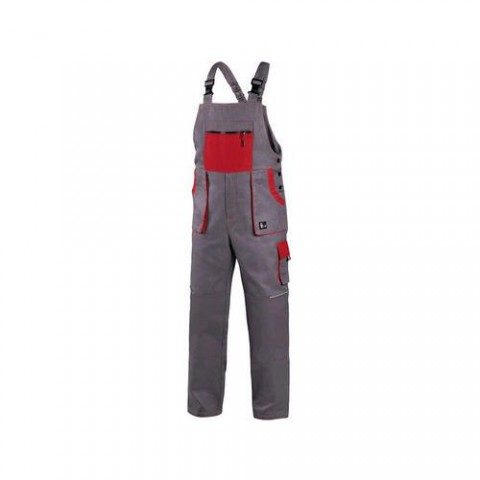 Šedé pánské montérky s laclem s červenými doplňky. Náprsní kapsa na zip, velké přední a menší boční kapsy schovají telefon, metr a další drobné předměty potřebné k práci. Zdvojená vyztužená partie kolen pomůže při častém klečení. Kšandy do gumy se zapínáním na plastovou přezku.Pánské montérkové kalhoty CXS s laclem, šedé/červené