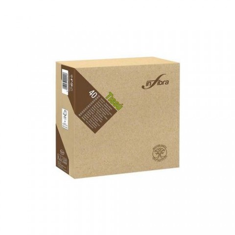 Koktejlové ubrousky BIO-EKO Infibra. 100% ekologicky bio recyklované (při recyklaci nejsou použity chemické látky ani enzymy). Ubrousky mají díky čisté recyklaci přírodní hnědou barvu. Jsou hebké na dotek, pevné, savé, s efektem netkané textílie. Kvalitní bio ekologické ubrousky, které NEJSOU vyrobeny recyklovatelnou metodou FiberPack (recyklace nápojových kartonů Tetra Pack). Ubrousky jsou vyrobeny jedinečnou výrobou za tepla, která umožňuje získat vysoce kvalitní papír, recyklací kartonů a 100% celulózových zbytků bez použití chemických přísad, rozpouštědel a optických bělidel, které jsou škodlivé pro člověka a přírodu. Záruka prémiově recyklovaného certifikovaného papíru, který je bezpečný při styku s kůží, potravinami, je dermatologicky testován a nezapáchá ani v mokrém stavu. Z PŘÍRODY PRO PŘÍRODU! Ekologická-Bio kvalita - výkon - udržitelnost.Papírové ubrousky BIO-EKO Infibra 2vrstvy 38x38cm, béžová, 40ks