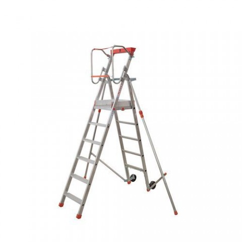 Hliníkové pracovní schůdky se šesti stupni a pracovní plošinou. Pracovní plošina má rozměr 40,5 x 51 cm, je perforovaná a vybavená ochranou proti sklouznuti nohy. Bezpečnostní zábradlí s plastovým držákem na nářadí a s popruhy pro zabezpečení osoby. Schůdky jsou skládatelné a lze je jednoduše přemístit pomocí dvou pojezdových koleček o průměru 150 mm. Stabilitu při rozložení zajišťují kovové stojiny. Příčky mají protiskluzový povrch a šíři 85 mm. Schůdky jsou opatřené plastovými patkami.Pojízdný hliníkový plošinový žebřík Facal s držákem, 6 stupňů