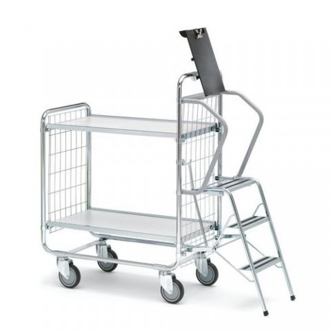 Policové vozíky se dvěma policemi vybavené praktickými schůdky. Schůdky umožňují vystoupit do výšky 60 cm nad podlahu, jednoduše se rozkládají a automaticky stahují. Povrch schůdků zabraňuje uklouznutí. Vozík je vybaven držákem na dokumenty formátu A4. Police pokryté odolným laminátovým nátěrem lze z vozíku odnímat. Kratší strany vozíku jsou opatřené mřížovými bočnicemi s oky 50 x 100 mm. Pojezd zajišťují čtyři otočná kola s valivými kuličkovými ložisky. Povrchová úprava pozinkováním.Policové vozíky Ergobjorn se schůdky, do 200 kg, 2 police