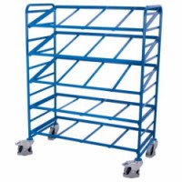 Dlouhý vozík s pěti policemi bez desky vhodný pro umístění plastových přepravek o rozměru 600 x 400 mm. Naklonění polic o 17° nebo 32°, výška hrany 27 mm, nosnost 50 kg na polici. Vzdálenost mezi příčnými trubkami 125 mm. Rozteč otvorů pro přišroubování polic 150 mm. 4 otočná kola, z nichž dvě jsou opatřená brzdou. Šedá kola z termoplastické pryže nezanechávající stopy na plastovém ráfku s přesnými kuličkovými ložisky.Policové vozíky Euro na přepravky se šikmými policemi, 5 polic, 135 x 66,5 x 170 cm