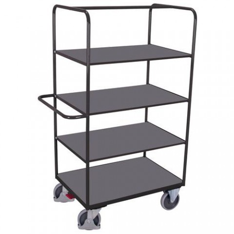 Policové vozíky se svařovanou ocelovou konstrukcí. Pevná základní plošina a 3 skládací police z MDF desek. Madlo na čelní straně vozíku. 2 pevná a 2 otočná kola s brzdou EasySTOP. Šedá kola z termoplastické pryže nezanechávající stopy na plastovém ráfku s přesnými kuličkovými ložisky.Policové vozíky se skládacími policemi, 4 police