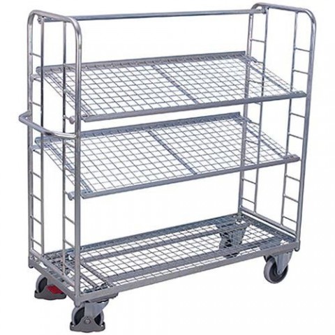 Pozinkovaný vozík se spodní pevnou a dvěma variabilními mřížovými policemi. Rozměr oka police 50 x 50 mm, sklon 15°, výška hrany 15 mm. Interval uchycení police 120 mm. Madlo na čelní straně vozíku. 2 pevná a 2 otočná kola s brzdou EasySTOP. Šedá kola z termoplastické pryže nezanechávající stopy na plastovém ráfku s přesnými kuličkovými ložisky.Pozinkované policové vozíky se šikmými mřížovými policemi, 3 police