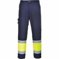 Dvoubarevné pracovní kalhoty s reflexními pruhy. Celkem 8 kapes pro uložení věcí, D kroužek pro ID kartu, elastický pás v zadní části. Tkanina odr??ží 98 % UV záření (UPF 50+). Vyrobeno za 65% polyesteru a 35% bavlny 245 g. Splňují normy EN ISO 20471 Třída 1; ANSI/ISEA 107-2015 SUPPLEMENTAL Třída E.Reflexní kalhoty Combat Hi-Vis, modré/žluté