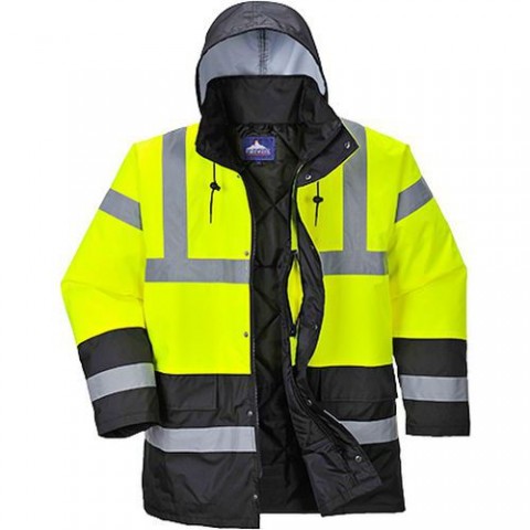 Zateplená reflexní bunda s vysokou odolností vůči chladu, a to až do -40 °C. Čtyři kapsy pro ukládání věcí, skrytá stahovatelná kapuce v límci a stahovatelný spodní lem. Dvoucestný krytý zip, pletené manžety. Tkanina odráží 98 % UV záření (50+ UPF), vodní sloupec 15 000 mm. Vnější tkanina 100% polyester, PU zátěr 190 g, podšívka 100% polyester 60 g, výplň 100% polyester 170 g. Splňuje normy ANSI/ISEA 107-2015 TYPE R Třída 3; AS/NZS 4602.1:2011 Třída D/N; EN 343:2019 Třída 3:1 X WP 15,000 mm; EN 342 0.345 (M2.K/W), 2, X; EN ISO 20471 Třída 3.Reflexní nepromokavá bunda Contrast Traffic Hi-Vis, žlutá/černá