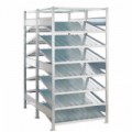 Jednostranné spádové regály Astraia jsou vyrobeny z pozinkované oceli. Stojiny s pozinkovanými patkami jsou tvořeny z T-profilů a jsou spojeny třemi postranními rámy. Čelní, 15 mm vysoký, nosník v šedé barvě (RAL 7035) zabraňuje vypadnutí zboží. Police se 14° sklonem jsou vybaveny dvěmi bočními lištami. Pro optimální organizaci zboží jsou police rovněž vybaveny pěti oddělovači, které lze dle potřeby horizontálně nastavit v rastru 50 mm. Přestavitelnost polic v rastru 25 mm. Snadná montáž díky zásuvnému (plug-in) uložení polic. Regály jsou vhodné zejména do skladů se skladovací metodou FIFO.Kovové regály se šikmými policemi Astraia