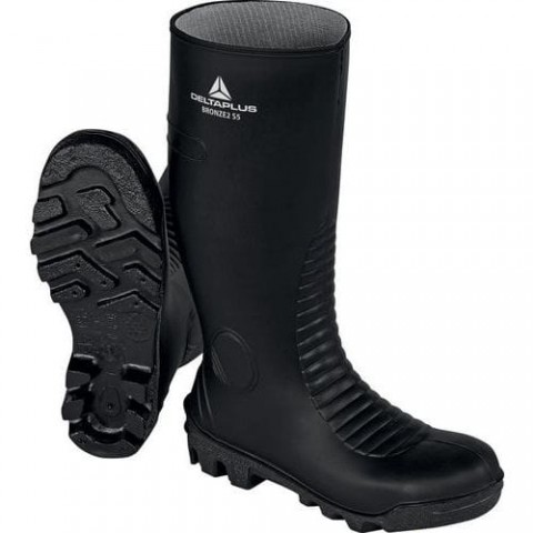 Svršek: PVC. Podšívka: polyester. Ochrana malleolu. Uvolňovací výstupek. Ochranný hrot: nerezová ocel. Antiperforační podr??žka: nerezová ocel. Podešev: PVC - Nitril s velkými cvočky.S5 SRA PVC bezpečnostní boty - Černá - Delta Plus