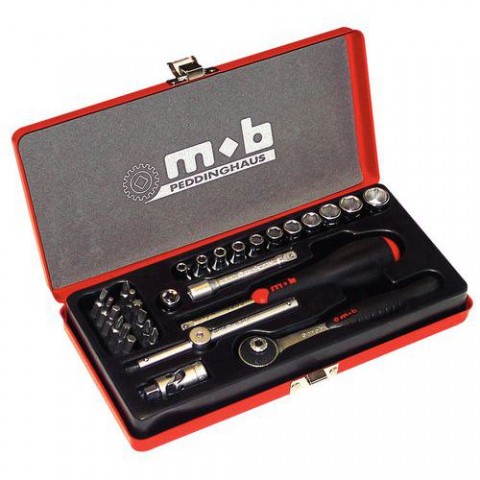 Obsahuje: 1 kulatá 72zubá ráčna. 11 šestihranných nástrčných hlavic: 4 – 4,5 – 5 – 5,5 – 6 – 7 – 8 – 9 – 1 – 11 – 13 mm. Prodloužení 75 mm. 1 univerzální kloub. 1 posuvná rukojeť. 1 otočná matice. 1 adaptér bitů. 2 ploché bity 4 – 5 mm. 2 bity Phillips PH č. 1 – 2. 2 bity Pozidriv PZ č. 1 – 2. 4 šestihranné bity: 3 – 4 – 5 – 6 mm. 2 bity Torx T č. 3 – 4.Sada 6hranných 1/4'' bitů Mob, 29 ks