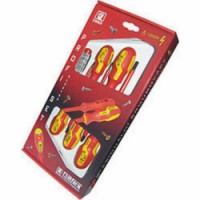 Šestidílná sada šroubováků. Určeno pro bezpečnou práci pod napětím v elektrotechnických oborech. Šroubováky schválené Státní zkušebnou splňují požadavky EN 60900:2004 (IEC60900:2004). Každý šroubovák je zkoušen na průraz elektrickým proudem ve vodní lázni při napětí 10 000 V. Je zaručena bezpečná práce až do napětí 1 000 V. Obsah sady: 1x plochý šroubovák o rozměrech: 2,5 x 75 mm. 1x plochý šroubovák o rozměrech: 4,0 x 100 mm. 1x plochý šroubovák o rozměrech: 5,5 x 125 mm. 1x křížový šroubovák o rozměrech: PH1 x 80 mm. 1x křížový šroubovák o rozměrech: PH2 x 100 mm. 1x zkoušečka napětí 150 - 250 V.Sada šroubováků 6dílná PL/PH+ZK S-LINE 1000V, NAREX 855760
