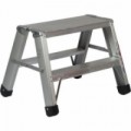 Oboustranné ocelové schůdky se dvěma stupni, vhodné do skladů, archívů, knihoven apod. Stupně jsou vyrobené z protiskluzové a voděodolně dřevotřísky, vzdálenost mezi stupni je 23 cm. Opatřené 2 kolečky o průměru 50 mm a ochrannými patkami. Povrchová úprava práškovým lakem RAL 3001.Pojízdné ocelové schůdky s plošinou, 2 x 2 stupně