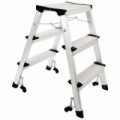 Oboustranné skládací schůdky s plošinou. Díky lehké hliníkové konstrukci jsou snadno skladovatelné. Transport zajišťují 4 kolečka (průměr 30 mm), která se při zatížení zabrzdí a zamezí tak dalšímu pohybu a nebezpečí pádu. Povrchová úprava eloxováním, součástí jsou ochranné patky. Schůdky splňují normu ISO 9001.Pojízdné hliníkové schůdky s plošinou Manutan Expert, oboustranné, 2 x 3 stupně