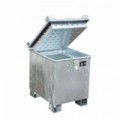 Speciální kontejnery pro skladování lithium-iontových baterií. Vyrobený z ocelového plechu. Uzamykatelné víko s pružinovou rukojetí. Slouží rovněž jako ochrana proti požáru díky chladicímu účinku výplňového materiálu. Manipulace pomocí vysokozdvižných vozíků.Speciální kovové kontejnery na baterie