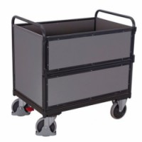 Skříňový vozík s výklopnou boční stěnou. Dvě madla na čelních stranách vozíku. Ložná plocha a stěny z MDF desek, výška stěny 71 cm. 2 pevná a 2 otočná kola s brzdou EasySTOP. Šedá kola z termoplastické pryže nezanechávající stopy na plastovém ráfku s přesnými kuličkovými ložisky.Skříňové vozíky s výklopnou stěnou, do 500 kg