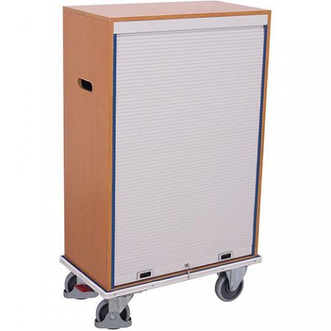 Skříňov?? vozík na dokumenty a šanony z MDF desek s 9 přihrádkami. Uzavírání vozíku roletou s cylindrickým zámkem. Zapuštěná rukojeť v čele vozíku. Výška přihrádky 330 mm, šířka 250 mm a hloubka 400 mm. Šedá kola z termoplastické pryže nezanechávající stopy na plastovém ráfku s přesnými kuličkovými ložisky. Dvě pevná a dvě otočná kola o průměru 160 mm s brzdou EasySTOP.Skříňový vozík na šanony s roletou, 9 přihrádek, 87,5 x 49 x 146 cm