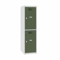 Snížené svařované šatní skříně se dvěma samostatně uzavíratelnými boxy. Jsou vhodné do škol a díky své výšce jsou ideální i pro žáky prvního stupně. Vyrobeny z ocelového plechu s povrchovou úpravou práškovým lakem. Skříně jsou vybaveny dvěma policemi na knihy a háčkem na oblečení. Větrací mřížky ve dveřích, úhel otevření dveří s bezpečnostní pojistkou max. na 90°, samolepicí štítek na jméno, možnost dokoupení horního šikmého nástavce. Uzamykání otočným uzávěrem na visací zámek (visací zámek není součástí dodávky).Snížené školní šatní skříně, 2 oddíly, 400 mm, otočný uzávěr