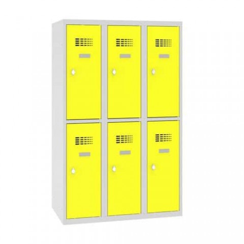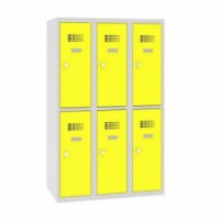 Snížené svařované šatní skříně se šesti oddíly vhodné do škol. Díky své výšce jsou ideální i pro žáky prvního stupně. Vyrobeny z ocelového plechu s povrchovou úpravou práškovým lakem. Skříně jsou vybaveny dvěma policemi na knihy a háčkem na oblečení. Větrací mřížky ve dveřích, úhel otevření dveří s bezpečnostní pojistkou max. na 90°, samolepicí štítek na jméno, možnost dokoupení horního šikmého nástavce. Uzamykání otočným uzávěrem na visací zámek (visací zámek není součástí dodávky).Snížené školní šatní skříně, 6 oddílů, 300 mm, otočný uzávěr