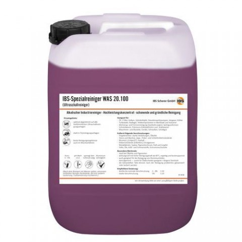 Průmyslová čisticí kapalina na vodní bázi pro odstranění silného znečištění. Vhodné použití v ultrazvukových čističkách, vysokotlakých čističích a dalších čisticích procesech. Lze použití na olejové filtry, písty, hlavy cylindrů, vstřikovací zařízení, karburátory, chladiče, ložiska kol, díly a komponenty v dílnách a průmyslu. Odstraňuje karbonové usazeniny, saze, grafit, pryskyřice, vosk, zbytky z lakování, leštění a broušení, dále pak zbytky lepidel (z etiket), emulgátory, bitumen (živice), asfalt, tuky, oleje, chladící maziva a mazací oleje. Deemulgující - vhodný pro odlučovače olejů, šetrný k životnímu prostředí. Doporučené dávkování při lehkém až středním znečištění 3 - 4 %, při vysokém znečištění 5 %. Čisticí kapalina splňuje požadavky týkající se odpadních vod ÖNORM B 5104, B 5105 a B 5106.Speciální čisticí kapalina IBS WAS 20.100, ultrazvukový čistič, 20 l
