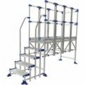 Modulární platforma se 3 zábradlími - 1 přední a 2 boční. Stabilní se širokou platformou a hlubokými protiskluzovými schůdky. Šířka plošiny 596 mm. Plošinu lze v případě potřeby připevnit k zemi pomocí velkých dvojitých pevných patek. Velmi odolná konstrukce, vhodná pro intenzivní používání, nutné rovné podlahy. Pohodlné, škálovatelné, všestranné, přizpůsobitelné všem typům potřeb.Přístupové plošiny Meca Modul Tubesca-Comabi, 3 zábradlí