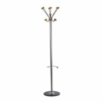 Volně stojící věšák vhodný do předsíní, kanceláří nebo vstupních hal. Stabilní kovová konstrukce s mramorovou základnou a detaily z masivního dřeva v odstínu buk. Stojan tvoří dvanáct háků na oděvy a držák na deštníky. Povrchová úprava práškovým lakem s chromovými doplňky.Stojanový věšák Mike