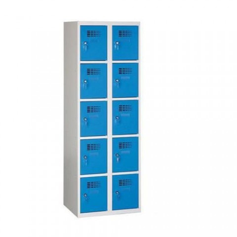 Svařované boxové skříně s odlehčenou konstrukcí a výztuhami zajišťujícími dobrou stabilitu. Vhodné pro odkládání osobních věcí na pracovištích, kulturních akcích, v převlékárnách apod. Vyrobeno z ocelového plechu tloušťky 0,5 mm. Perforovaná dvířka zajišťují účinné odvětrávání vnitřního prostoru. Dvířka jsou zavěšena na vnitřních pantech. Jednotlivé boxy jsou samostatně uzamykatelné cylindrickým zámkem s možností výměny za otočný uzávěr (nutno dokoupit zvlášť). Vnitřní prostor boxů je hladký a snadno udržovatelný. Možnost umístění štítku se jménem.Svařované šatní skříně Eric odlehčené, 10 boxů, cylindrický zámek