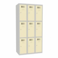 Šatní skříně s boxy v několika barevných variantách, vhodné pro odkládání osobních věcí zaměstnanců na pracovištích, v převlékárnách nebo sportovních klubech. Odlehčená konstrukce z ocelového plechu tloušťky 0,5 mm s výztuhami zajišťuje dobrou stabilitu. Účinné odvádění vlhkosti z oděvů větracími otvory na dveřích. Dvířka boxů jsou zavěšená na vnitřních pantech. Uzamykání každého boxu cylindrickým zámkem. Snadno udržovatelný hladký prostor uvnitř boxu. Možnost umístění štítku se jménem v horní části dveří.Svařované šatní skříně Jeff, 9 boxů, cylindrický zámek
