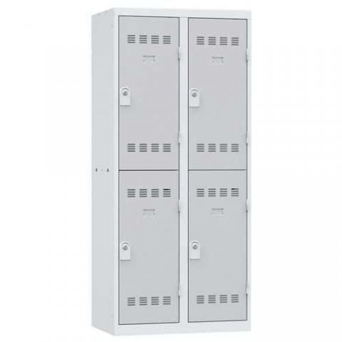 Více-oddílová šatní skříň svařovaná z ocelového plechu tloušťky 0,7 mm. Každý oddíl je vybaven tyčí na ramínka a dvěma háčky (uzamykání cylindrickým zámkem se dvěma klíči). Perforovaná dvířka zajišťují účinné odvětrávání vnitřního prostoru. Možnost umístění štítku se jménem.Svařované šatní skříně Vinco, 2 sloupce, 4 boxy, 400 mm, cylindrický zámek