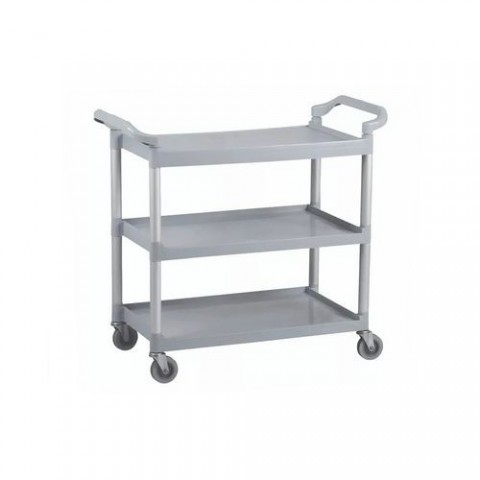 Úklidový vozík se třemi policemi vhodný do hotelů a ubytovacích zařízení. Hliníková konstrukce s plastovými policemi s nosností 30 kg/police. Madla na obou stranách vozíků pro snadnou manipulaci. Mobilitu zajišťují 4 otočná PVC kola s gumovým běhounem.Úklidový policový vozík s dvěma madly, do 90 kg