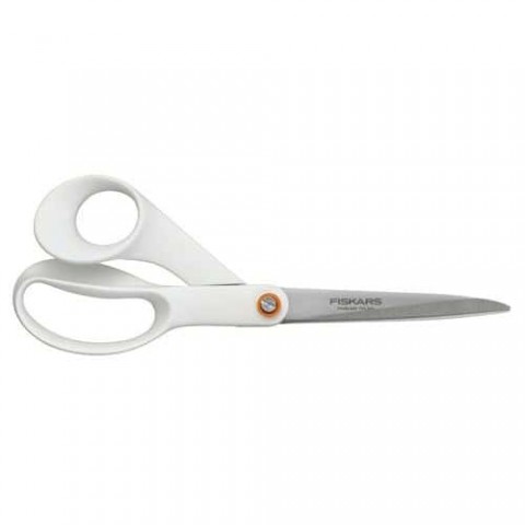 Univerzální nůžky Fiskars Functional Form™, bílé. Jedna zaoblená a jedna špičatá čepel pro větší univerzálnost. Pro univerzální řezání lehkých materiálů.Univerzální nůžky Fiskars