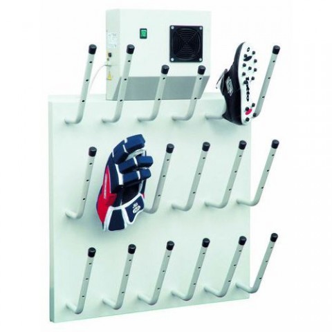 Vysoušeč bot, rukavic a lyžáků vhodný pro menší horské chaty, hotely nebo sportovní kluby. Nucená cirkulace proudu teplého vzduchu cca 45 °C zajišťuje rychlé, hygienické a bezpečné vysušení obuvi nebo rukavic. Orientační délka sušení vlhké obuvi je 30 minut a mokré obuvi 120 minut. Časový spínač není součástí balení. Pozdější montáž vysoušeče bez tohoto komponentu není možná. Montáž na stěnu.Vysoušeč obuvi a rukavic, 18 háků